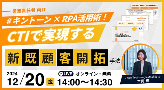 新人からトップセールスを輩出するコネクテッドセールス・プラットフォーム*「Front Agent」を開発・提供するUmee Technologies株式会社(本社:東京都調布市、代表取締役:新納 弘崇、以下「ユミー」)は、12月20日(金)14:00 - 14:30にオンラインセミナー「キントーン×RPA活用術:CTIで実現する新規顧客開拓手法とは」を開催いたします。