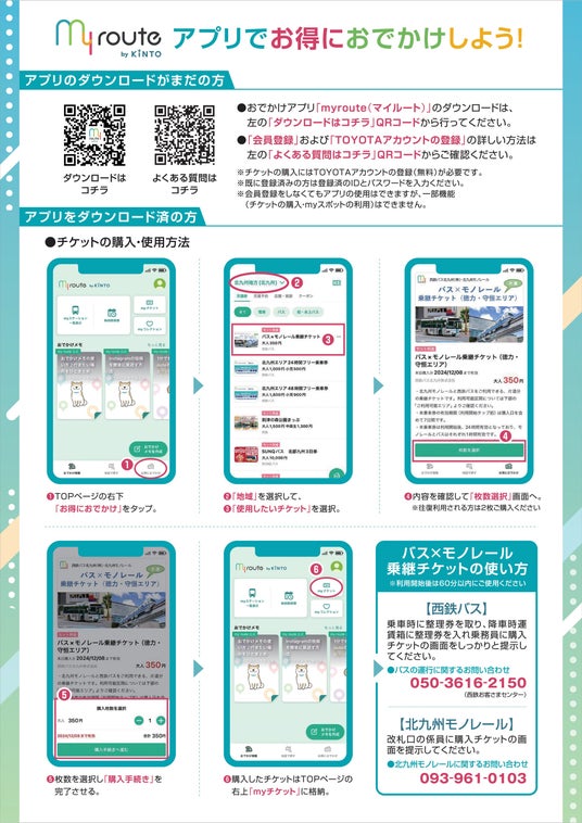 西鉄バス北九州(株)(本社:北九州市小倉北区、代表取締役社長:安田 堅太郎)と北九州高速鉄道(株)(本社:北九州市小倉南区、代表取締役社長:上田 浩、以下「北九州モノレール」)は、トヨタファイナンシャルサービス(株)が提供するおでかけアプリ「my route」を活用したデジタル乗車券「バス×モノレール 乗継チケット」を2024年12月20日(金)から2025年3月31日(月)の期間中、5,000枚限定で販売いたします。