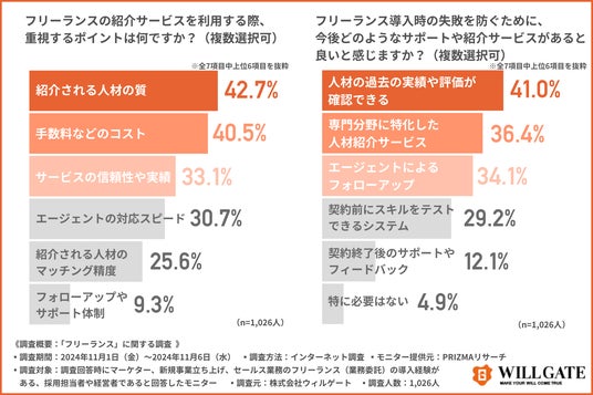 また、「フリーランス導入時の失敗を防ぐために、今後どのようなサポートや紹介サービスがあると良いと感じますか?(複数選択可)」と質問したところ、『人材の過去の実績や評価が確認できる(41.0%)』が最も多く、『専門分野に特化した人材紹介サービス(36.4%)』『エージェントによるフォローアップ(34.1%)』と続きました。