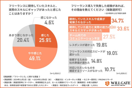 続いて「フリーランスに期待していたスキルと、実際のスキルにギャップがあったと感じたことはありますか?」と質問したところ、約7割の企業が『感じた(25.9%)』または 『やや感じた(49.1%)』と回答しました。