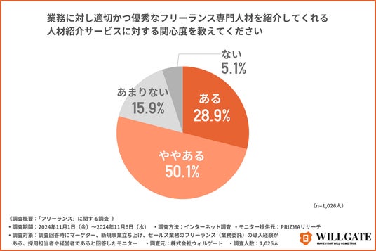 最後に、業務に対し適切かつ優秀なフリーランス専門人材を紹介してくれる人材紹介サービスに対する関心度を教えてください」と尋ねたところ、約8割の企業が『ある(28.9%)』または『ややある(50.1%)』と回答しました。