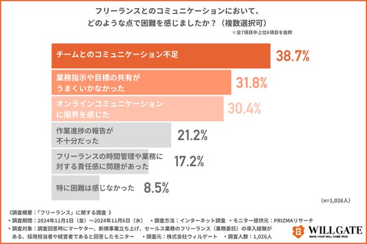 続いて、「フリーランスとのコミュニケーションにおいて、どのような点で困難を感じましたか?(複数選択可)」と質問したところ、『チームとのコミュニケーション不足(38.7%)』と回答した方が多く、次いで『業務指示や目標の共有がうまくいかなかった(31.8%)』『オンラインコミュニケーションに限界を感じた(30.4%)』『作業進捗の報告が不十分だった(21.2%)』と続きました。