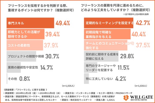 株式会社ウィルゲート(所在地:東京都港区、代表取締役:小島梨揮 、以下 ウィルゲート)は、マーケティング・新規事業立ち上げ・セールス業務におけるフリーランス(業務委託)の導入経験がある採用担当者や経営者を対象に、「フリーランス」に関する調査を実施しました。