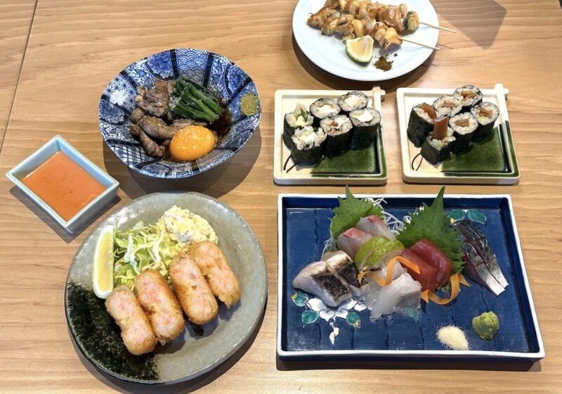メニュー:刺身3点(2貫ずつ)1,320円、刺身5点(2貫ずつ)1,980円、博多がめ煮770円、手羽先の唐揚げ(4本)660円、100%海老カツ880円、銀鱈みりん焼き1,100円、つぶ貝の醤油焼き串(1本)330円、せせりニラ玉ポン酢770円、肴まき(かんぴょう495円、イカ明太660円、アボカドあけがらし660円など)、海鮮丼990円、和牛スジと舞茸の細うどん880円、席代330円