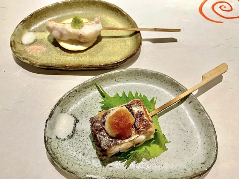 新鮮な魚介を炭火で焼いた「魚串」も名物のひとつで、写真は手前から脂がのった「太刀魚」(380円)と珍しい「キアラ」(580円)。その日の仕入れによって15種類以上がメニューに並び、同じネタでも刺身とはまた違った味が楽しめるのが、魚好きにはたまらない。
