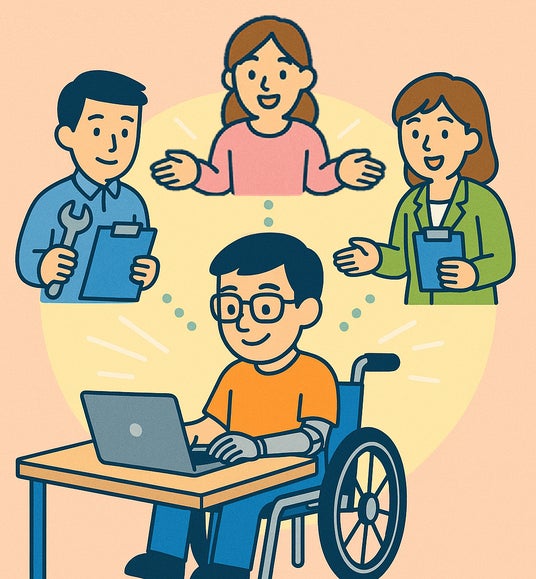 具体的には「就労支援機関」「ジョブコーチ」「就労支援を行う専門職」「リハビリテーションエンジニア」「支援機器と障害特性を調整できる医療福祉等の専門職」等を想定しています。