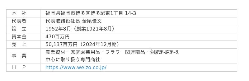食・農業を通して、持続可能な社会と人々の暮しを豊かにする商品やサービスを提供する、農業資材・家庭園芸用品・フラワー関連商品・飼肥料原料を中心に取り扱う専門商社です。2022年で創業 101 年を迎えたニチリウ永瀬は、2023年1月1日をもって、「株式会社welzo」に社名を変更。BtoB を中心としたビジネススタイルを築き、国内に24拠点を置いています。 社内外のビジネスパートナーと共創し、ITやAIの技術を活用しながら、日本が直面する課題にも積極的に取り組んでいます。