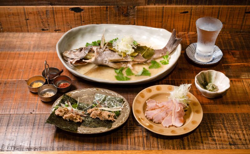 インスタグラムでお店を見つけた時から、私の良店レーダーがビビッと反応していましたが、それはお通しの時点で確信に変わりました。お通しは2、3種類から選べるようになっていて、いただいたのは「鯛の骨味噌海苔巻き」。鯛のアラに残った身をほぐして……というのはあっても、頭を圧力鍋で炊き、丸ごとすり潰して作っている味噌ははじめてで唸りました。秋田をはじめ、全国各地から選りすぐる日本酒のラインナップも素敵で至福~。