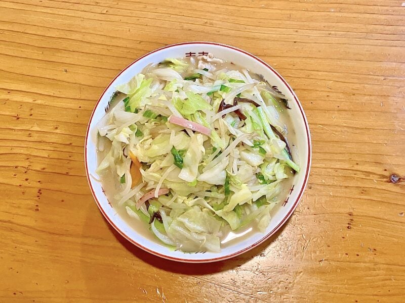さらに「栄養もたっぷり摂ってほしい」という思いから、豚肉とカマボコのほかに、キャベツ、もやし、玉ねぎ、人参、キクラゲといったたっぷりの野菜を炒めて山盛りにしたのが自慢の「ちゃんぽん」(960円)です! いったい何グラムほどの野菜を使っているのか尋ねても「片手でわしづかみにするので計ったことありません(笑)」とのことですが、一日に必要とされる摂取量の大半をカバーできそうですね。