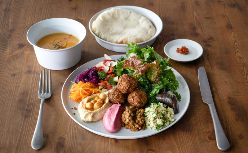 また、独立を決めてからの3年ほどは「DEAN & DELUCA 福岡」のデリカテッセンに入り、食材や異国料理への知識も深めたという二石さん。メニューにはこれまでの経験を活かし、“からだにやさしい”をテーマにした中東料理とデザートが揃います。ランチ・ディナー共に同じメニューを味わえるのも嬉しいポイント。まずは看板メニューの「ファラフェルと前菜プレート」(1,800円)をいただきました。