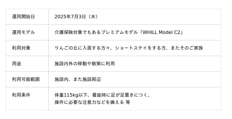 特別養護老人ホーム「りんごの丘」(施設長:吉尾幸治)などを運営する社会福祉法人そよかぜの会(所在:福岡県福岡市、代表者:濱崎太郎、以下「そよかぜの会」)とWHILL株式会社(本社:東京都品川区、代表取締役社長 CEO:杉江理、以下「WHILL社」)は九州地方で初めて施設内外の移動環境整備の一環として、免許不要で歩行領域を走行する近距離モビリティWHILL(ウィル)を導入することを発表いたします。入居者含む利用者様の移動負担と、施設スタッフの介助負荷を同時に軽減する狙いで、高齢化が加速する中でも、QOL(生活の質)を維持・向上しながら、できる限り自立的に暮らし続けられる体制の構築を目指します。