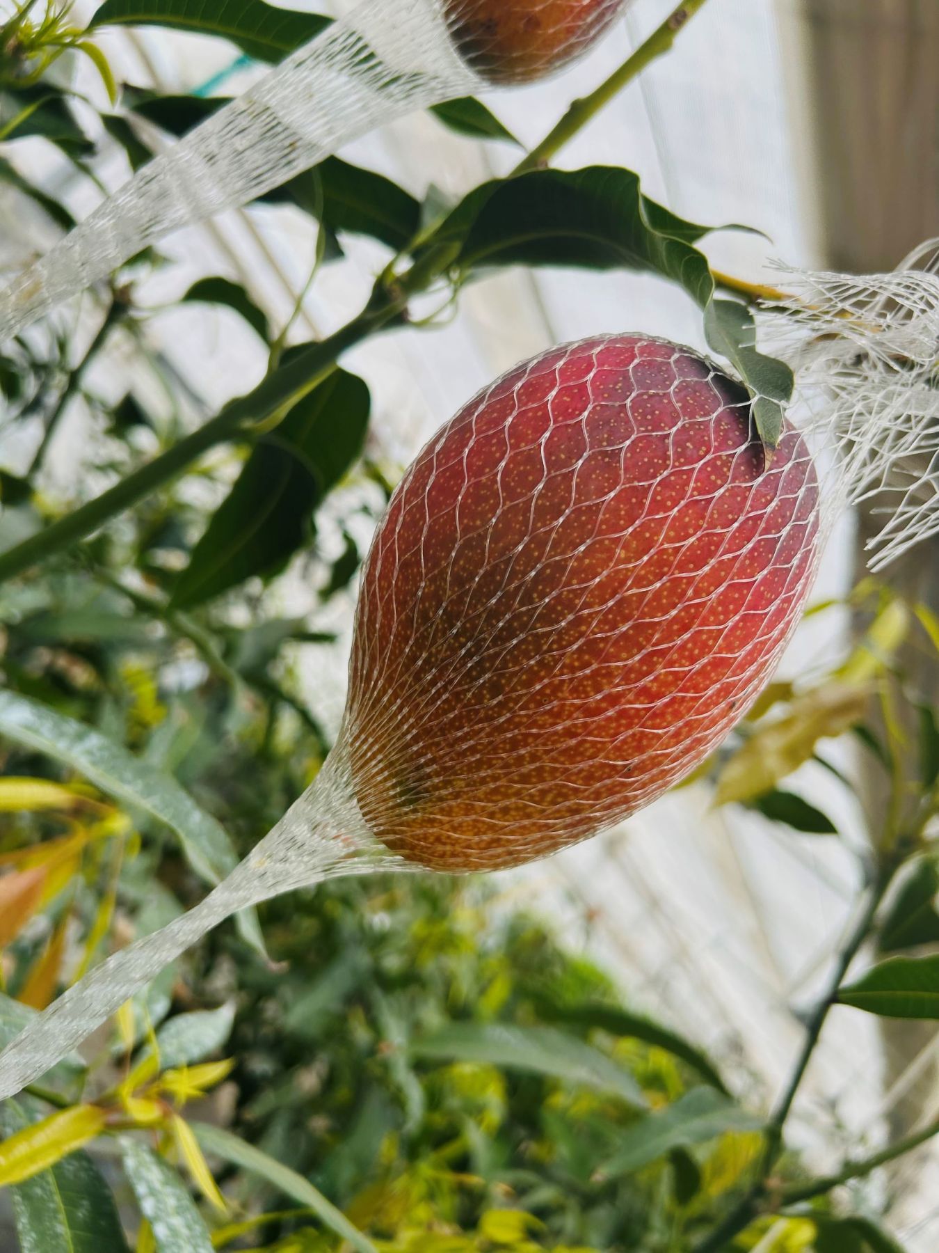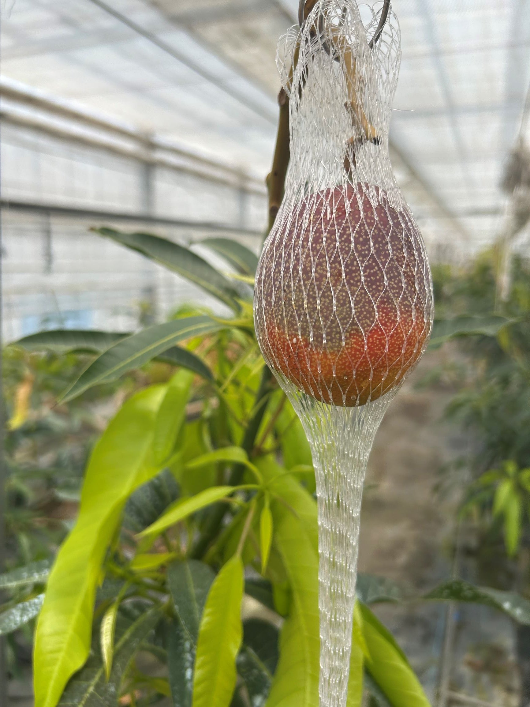 まるで南国の世界。濃い緑の葉から枝を釣り竿の様に伸ばし、美しい楕円のマンゴーが大切に網の中に包まれていました。熟すと枝から自然に実を離し、この網の中に落ちるそうですが、鼻を近付けると甘―い爽やかな香りにうっとり◎