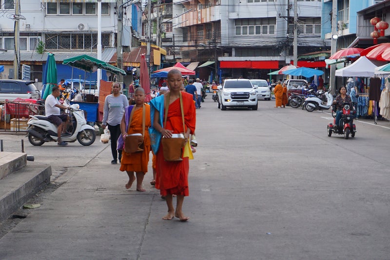 「タンチットヌソン市場」で托鉢をする若い僧侶たち