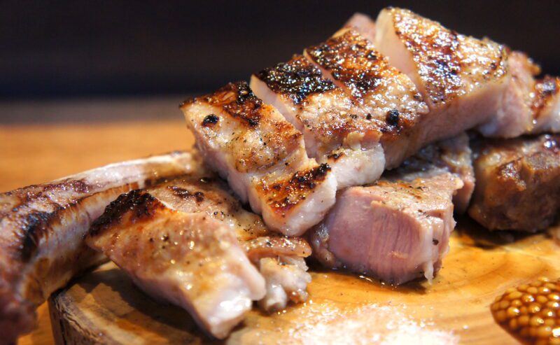 そしてこちらは「霧島産豚ローストマホーク」の炭焼です(1,980円)。300gの骨つき豚肉はインパクト大! 豪快にかぶりつく……わけではなく食べやすくカットしてくれます。松尾さんが惚れ込んだという豚肉は、産地から直送してもらっているそう。質感、旨み、甘み、どれをとっても上等です。