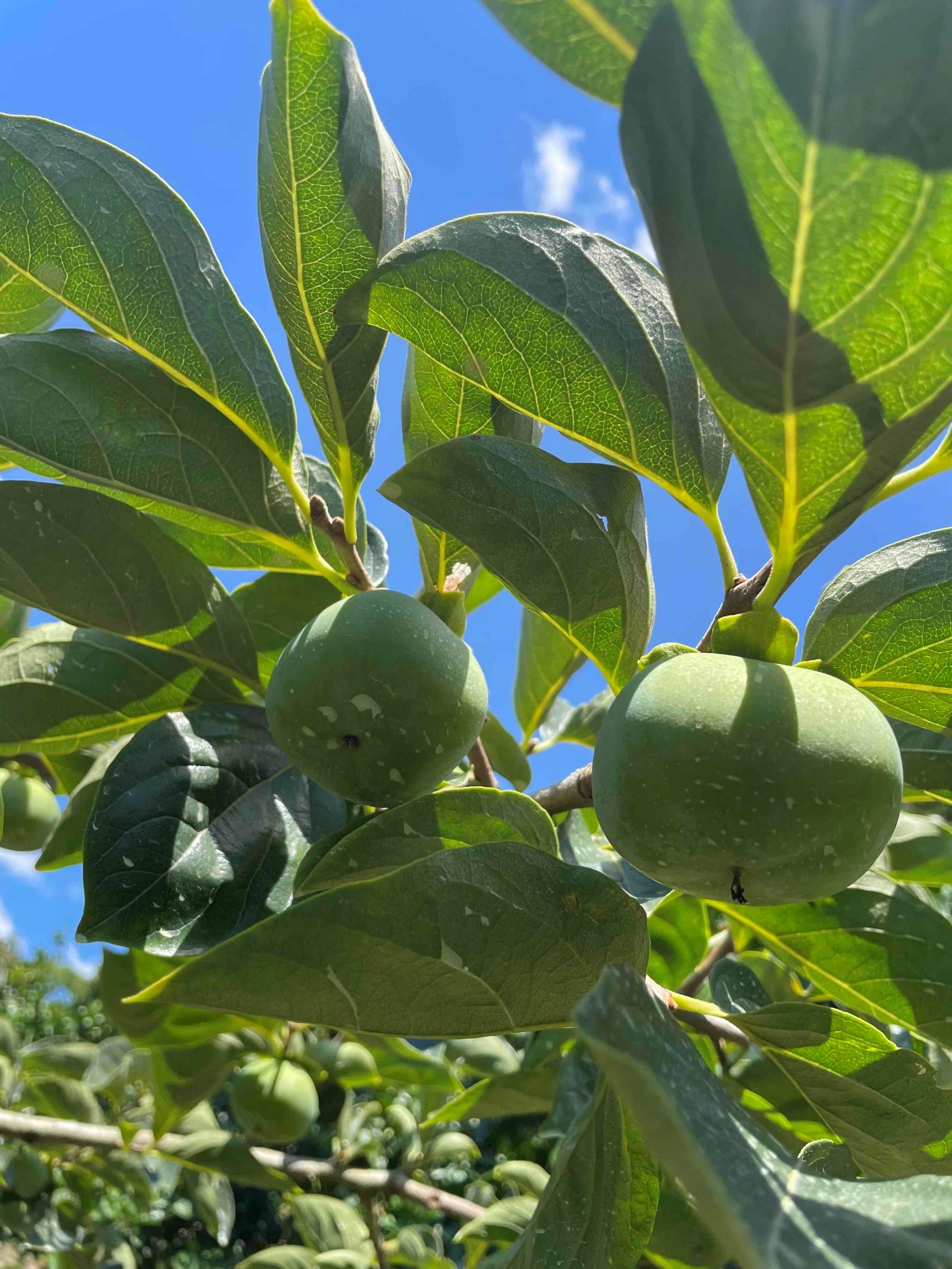 剪定と暑さの中で摘果作業などの管理をがんばることで大きくて高品質な柿ができる。