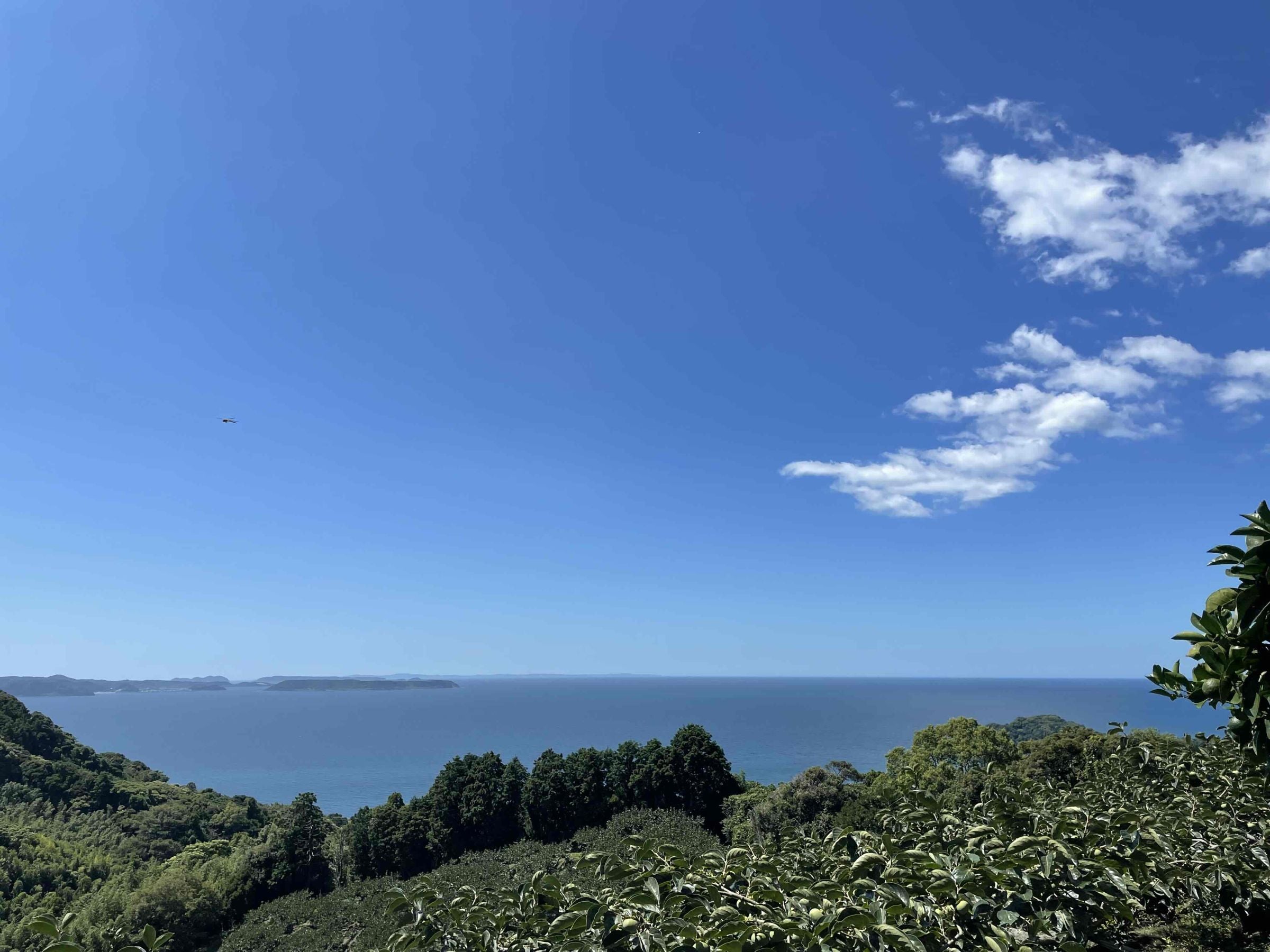 傾斜が40度くらいある登山道のような道を進むと、絵に描いたような景色が広がっていました。奥に見えるのは長崎県壱岐市だそうです。