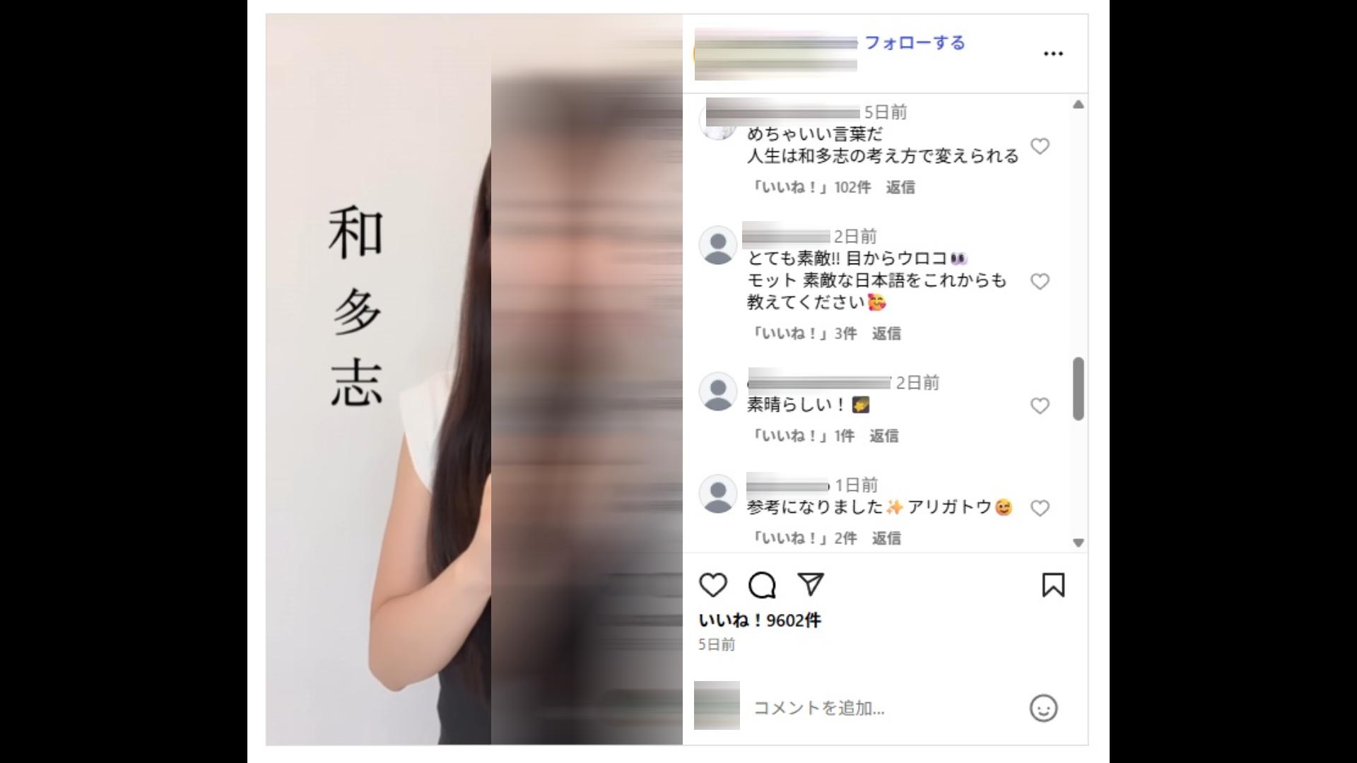 「和ごし」と言っていましたが、「みんなで和気あいあいとしている」という意味でしょうか。この解説自体、日本語としてはちょっとどうかなと思います(AI動画かもしれません)。この動画は8月13日に投稿され、9,524件の「いいね!」がついています。フォロワーは17,000人もいて、それなりに影響力がありそうです。