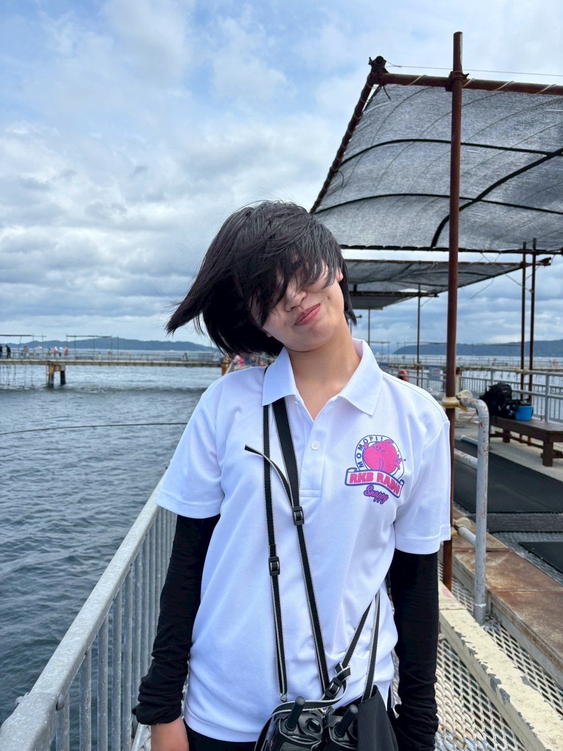 真夏の日差しが照り付ける海づり公園の桟橋。この日は風がやや強く吹いていて、比較的涼しく過ごせたのはよかったのですが、時折風になびく髪の毛で前が見えなくなりました。その姿が面白くて2人で大笑いしながら写真を撮り合いました。