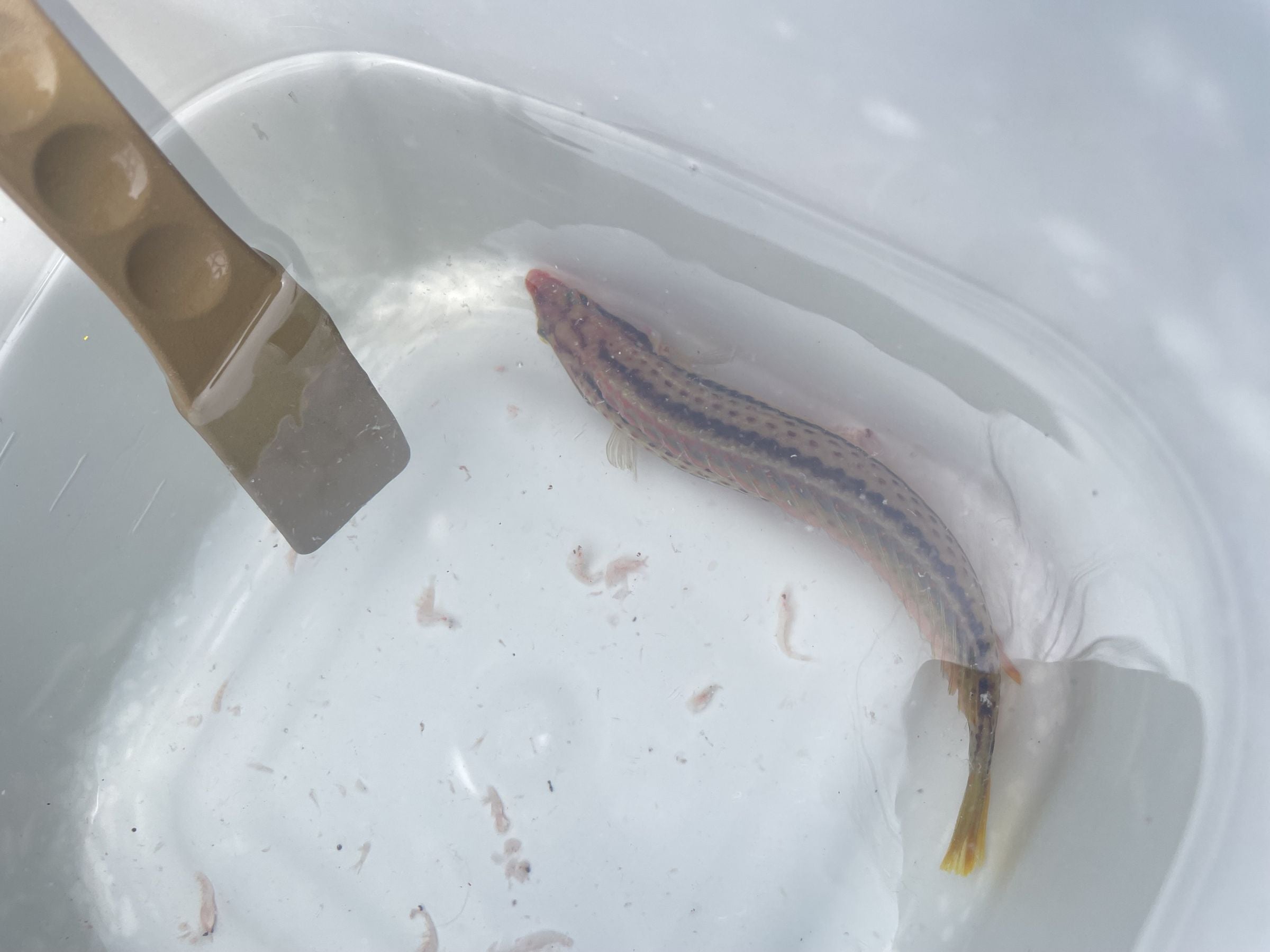 しかけを垂らし魚がかかるのを待っていると、「おっ!かかってるね」と指導員さんが一言。私にはかかった感触はわからなかったのですが、とりあえずくるくると巻いてみると、なんと魚が私の顔にアタック! 生きている魚の感触に少し面食らって叫んでしまいました。