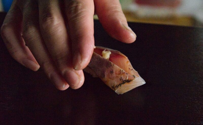 1週間寝かせた【アラ】は噛むほどに旨味を感じる、この日イチオシのネタ。25kg超えという大きさもおいしさの理由の一つ。