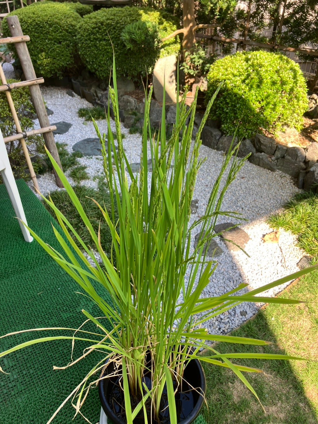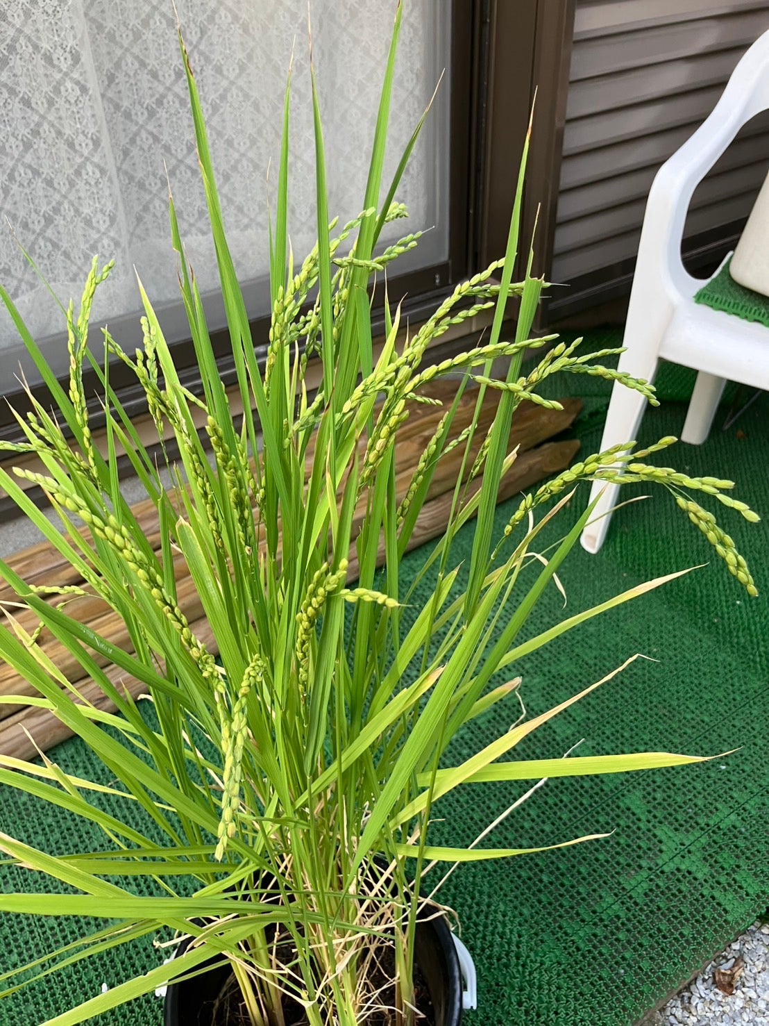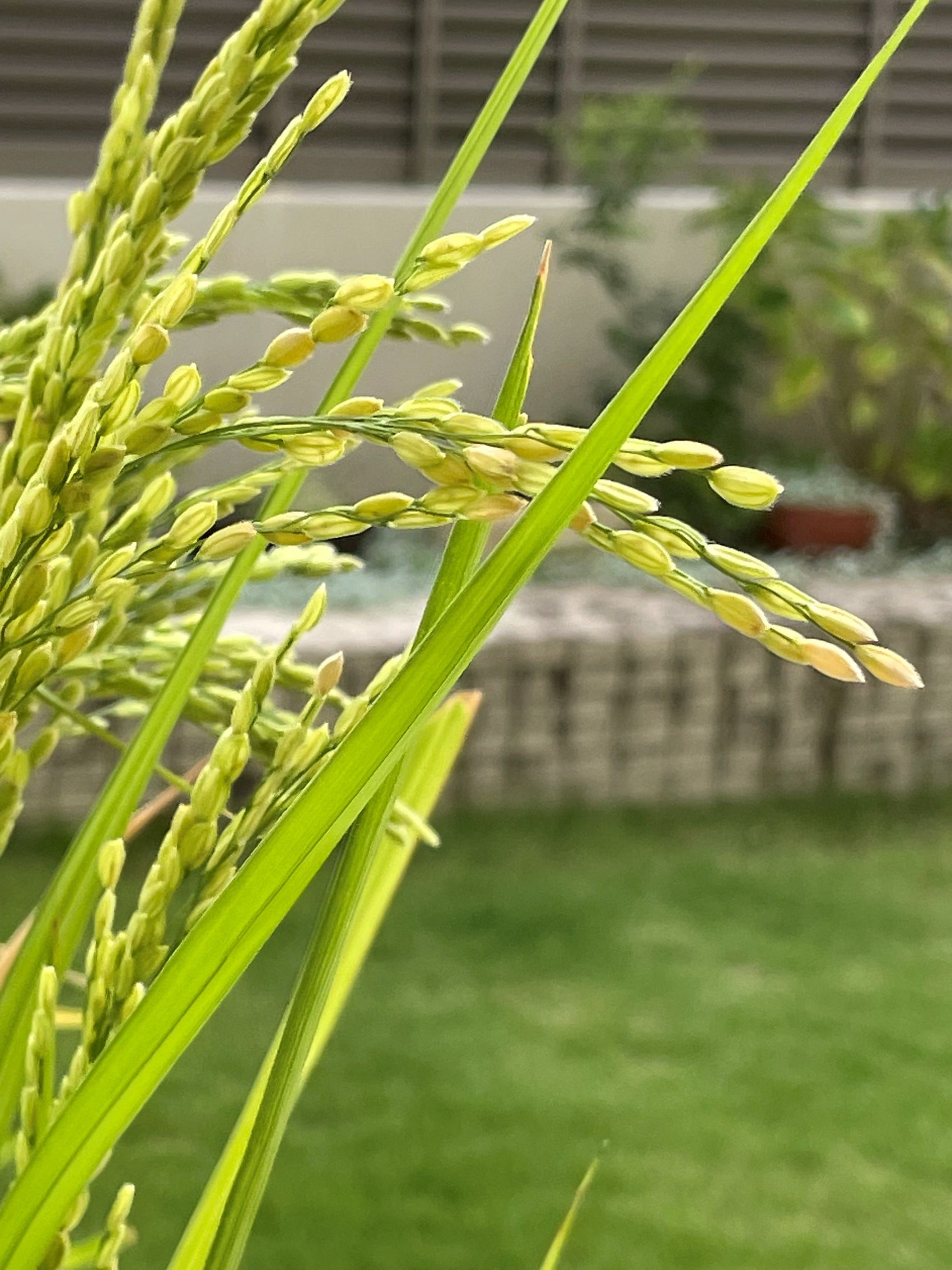 花は全ておわり、まだまだ黄緑色の🍖稲穂が重くなり何本かはこうべを垂れはじめました!