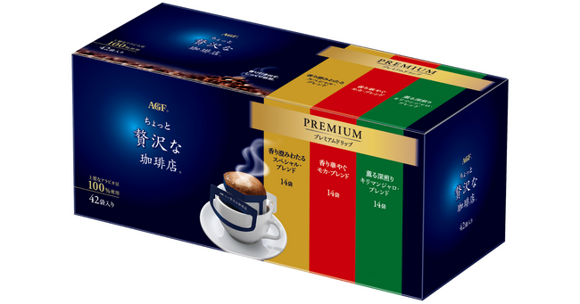 個包装タイプのドリップコーヒー《「ちょっと贅沢な珈琲店(R)」プレミアムドリップ》の〈スペシャル・ブレンド〉〈モカ・ブレンド〉〈キリマンジャロ・ブレンド〉の3種類の味わいを飲み比べして愉しめる、アソートパック。
