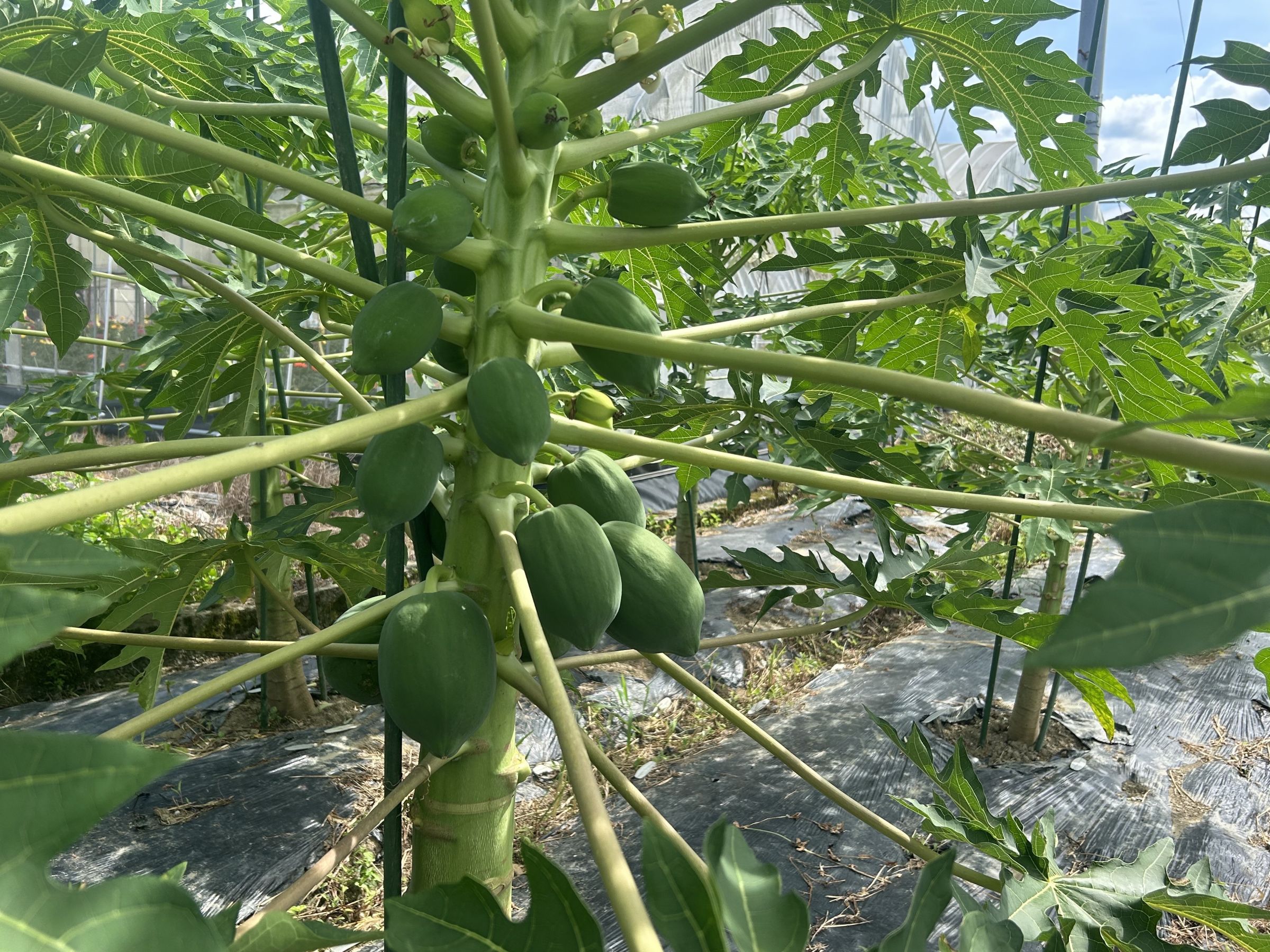 実は、古賀さんが農業を始めて最初に育てたのが、このパパイヤ。なぜかと伺うと、「最初はお花屋さんでヤシの木が欲しくて買ってみたら、それがパパイヤだったんだよ」と、まさかのエピソードを笑顔で話してくださいました(笑)。