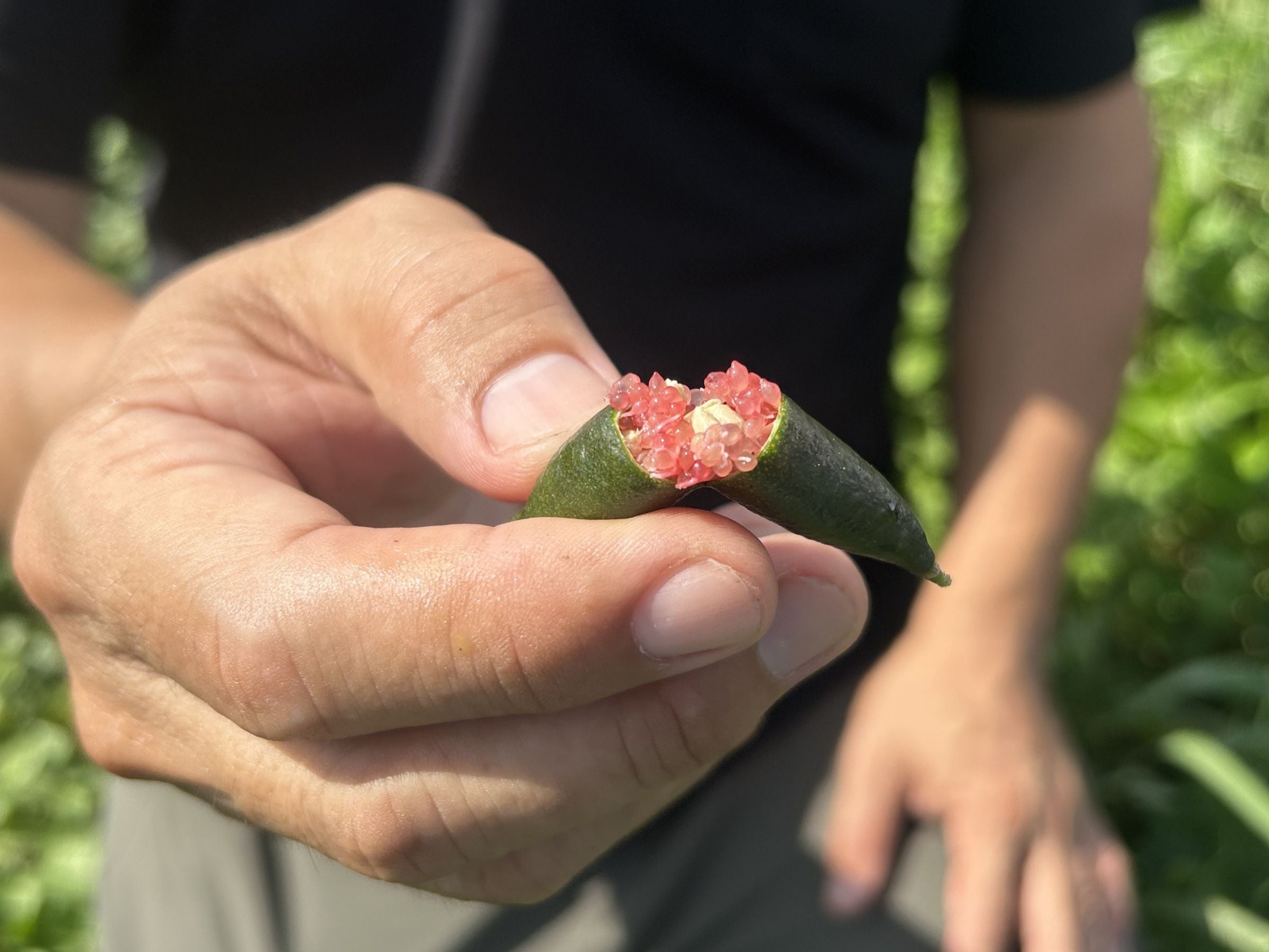まずご紹介するのは「フィンガーライム」という果物。表面だけ見ると、まるで枝豆や青唐辛子、スナップエンドウのよう…。でも、割ってみると中には小さなツブツブの果肉がぎっしり詰まっていて、その様子から「森のキャビア」と呼ばれているんです。