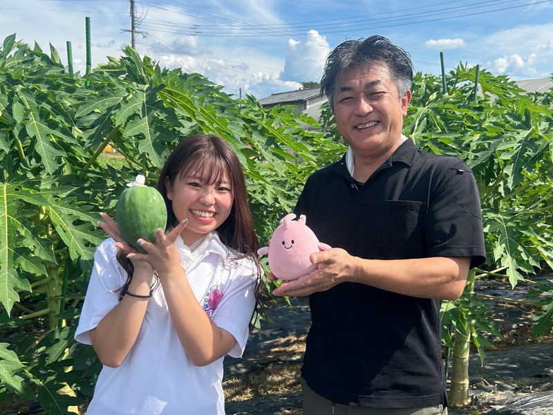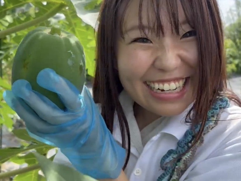 古賀萬壽果園さんには、もう一つ珍しい作物があります。それは「パパイヤ」。特別に収穫体験をさせていただきました。小さなナイフで枝を数センチ残して切り落とすと、パパイヤと枝から白い酵素があふれ出てきました。