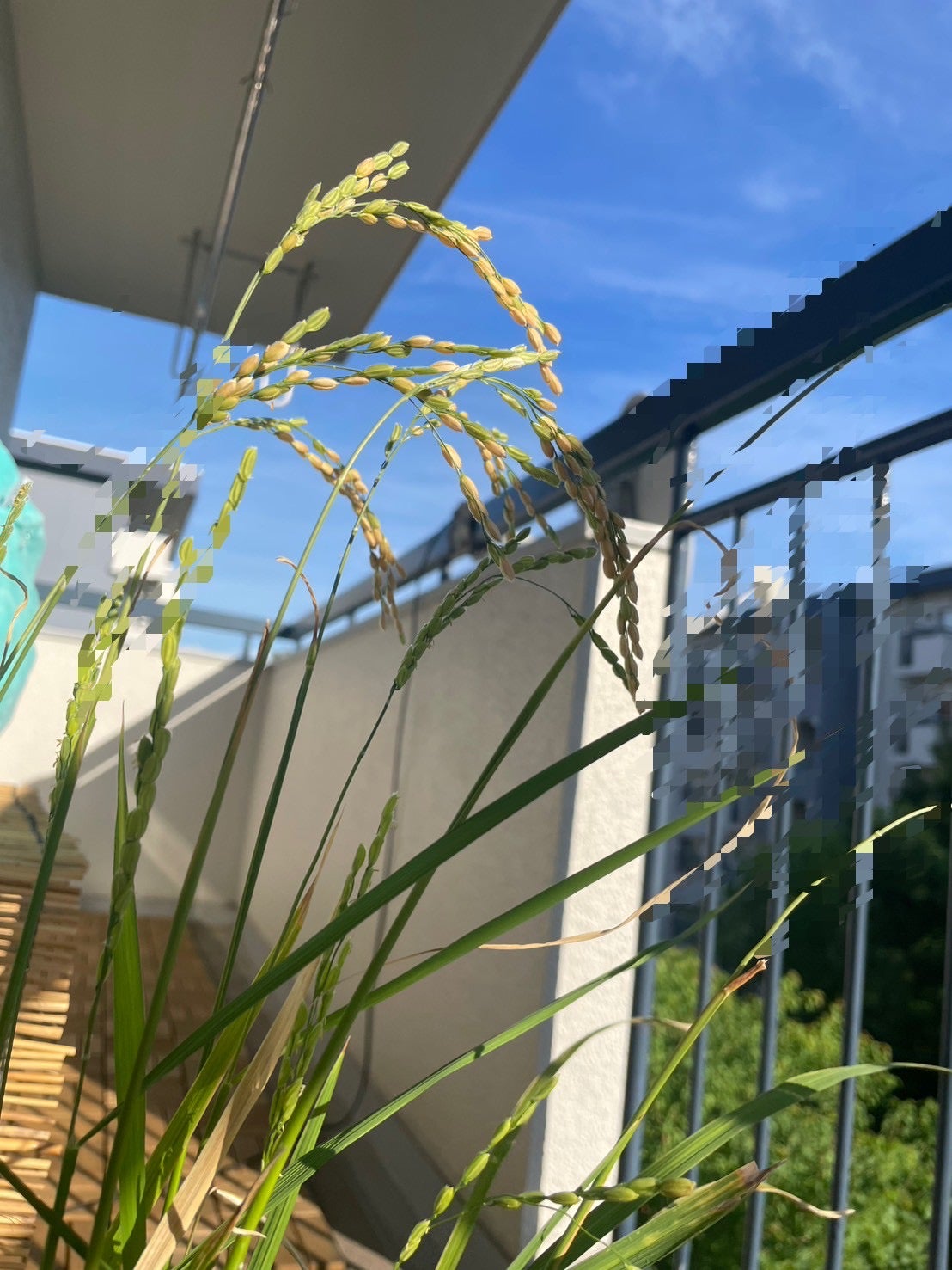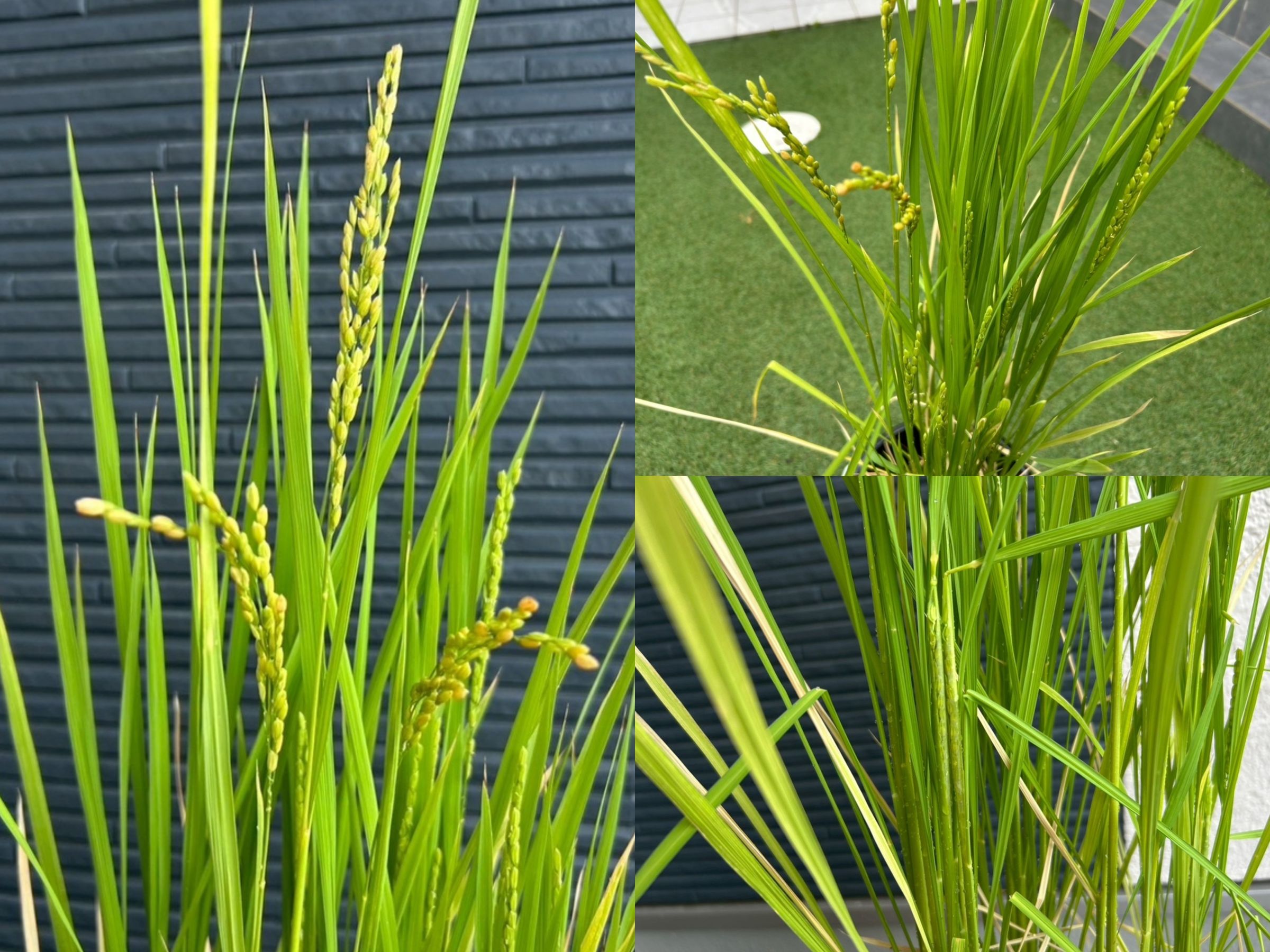 最初の稲穂は緑から黄金色へと変わる途中で少しずつ首を垂れ、いただいた里子さんからも続々と稲穂が出始めてきています。