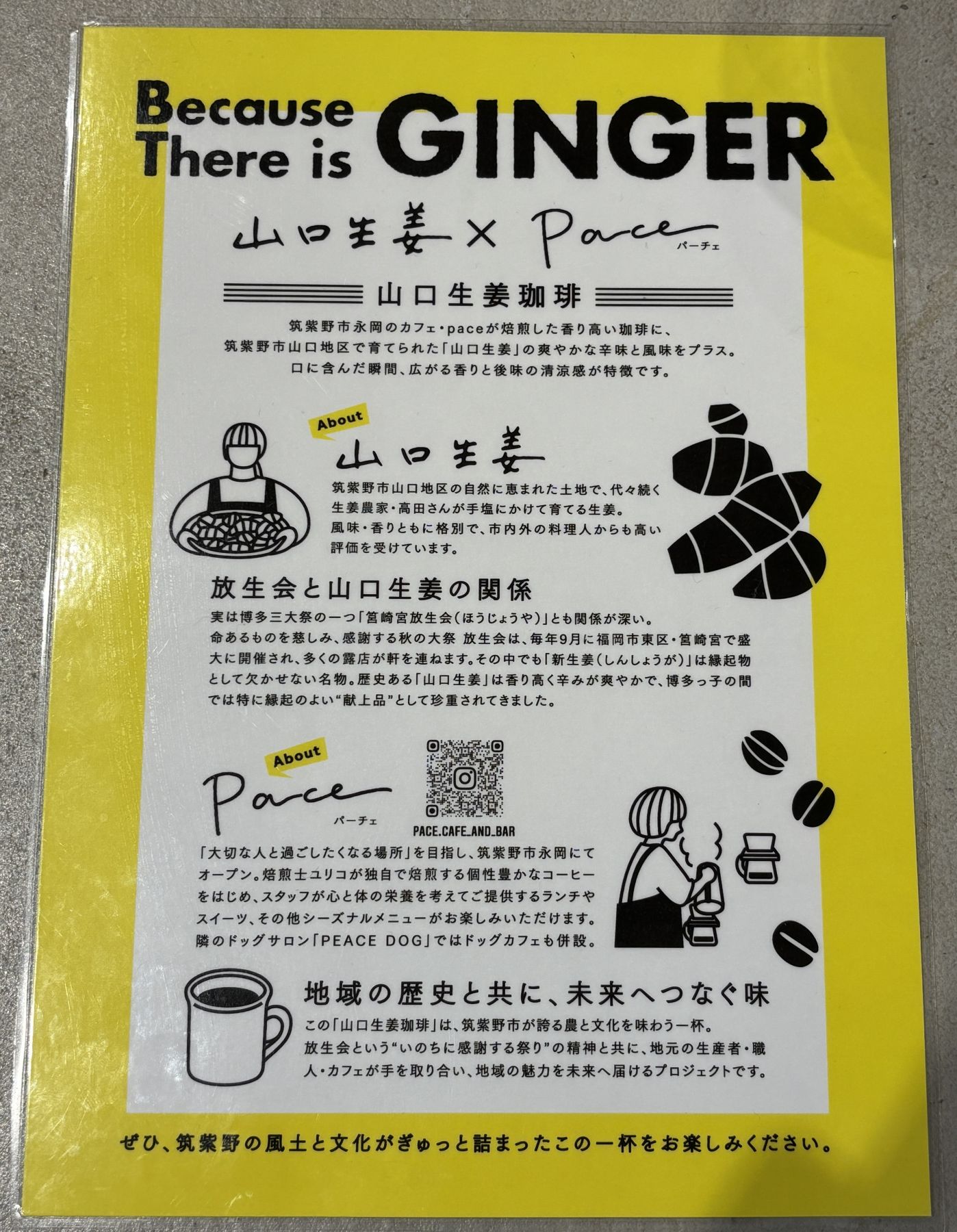 Pace cafe&barでは、今年5月から筑紫野市の特産品「山口生姜」を使ったメニューを提供しています。その中でも特に目を引くのが、今回ご紹介する「ジンジャーコーヒー」です。