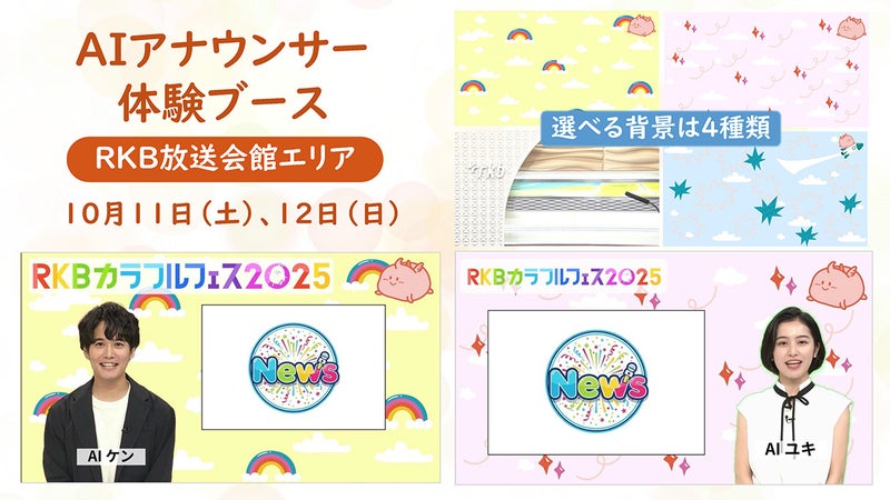 AIアナウンサー体験コーナーでは、最新のAI技術であなただけのオリジナル動画を制作します。アンケートで好きなことや今ハマっていること、頑張っていることなどを何でも教えてください。RKBアナウンサーのアバターが来場してくれたあなたについてご紹介します。