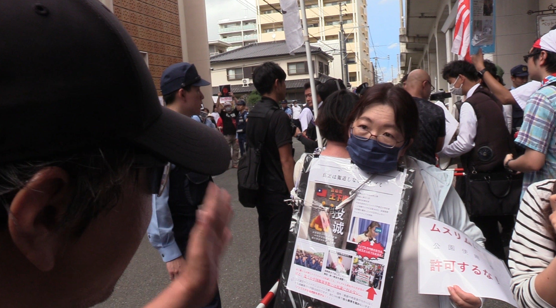 モスクに移ると、日本第一党への抗議に来ている人は30人くらいに増えていて、静かにプラカードを持って立っている高齢の女性もいれば、大きな声を出して街宣の声を消そう、押しつぶそうという男性もいました。ひどい騒ぎになり、地元の自治会長さんが様子を見に来ました。