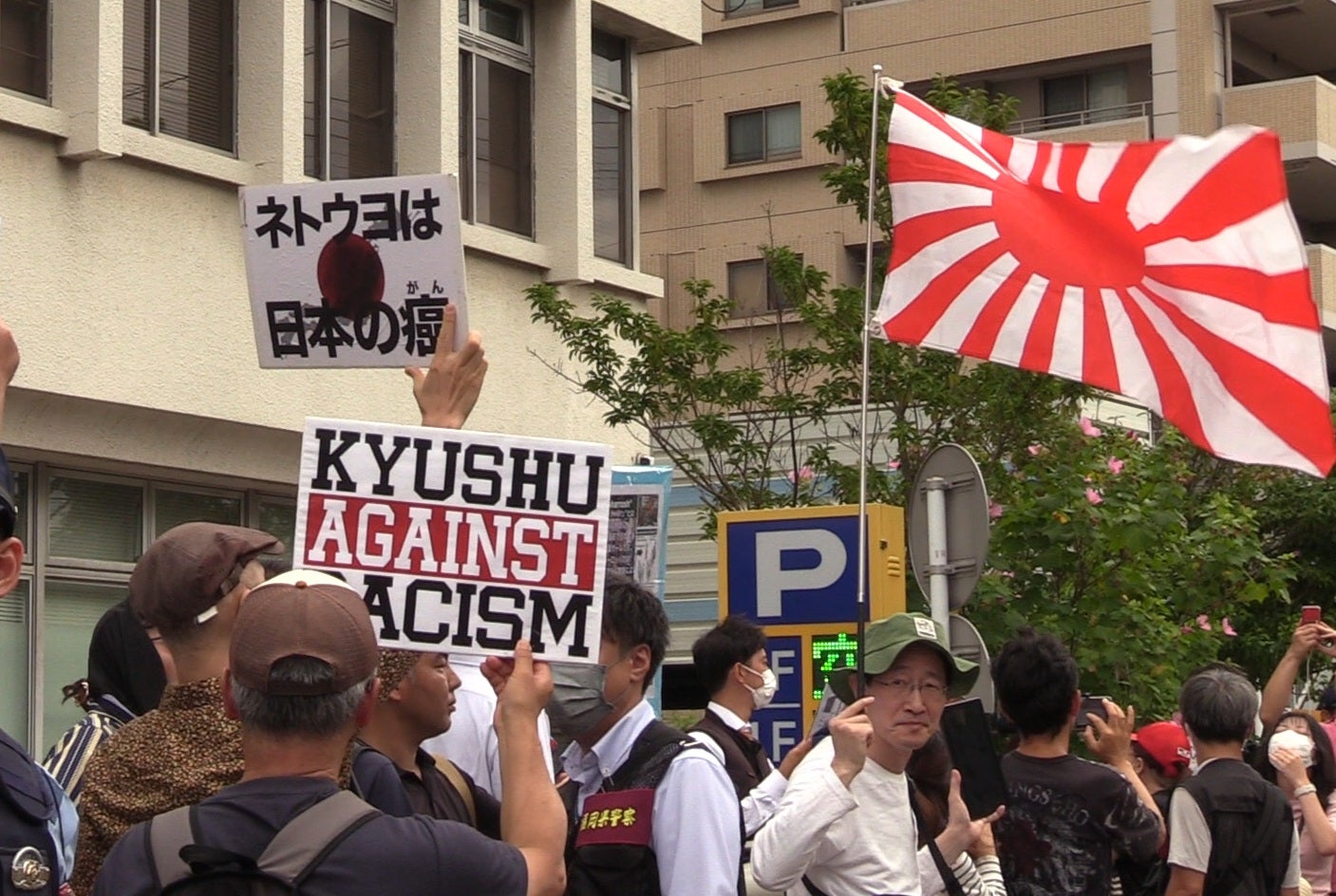 反対する人々: 「帰れ!」「ヘイトスピーチを止めろ!」「妄想とデマで、外国人憎悪を扇動するな!」 (大声が入り乱れての混乱)