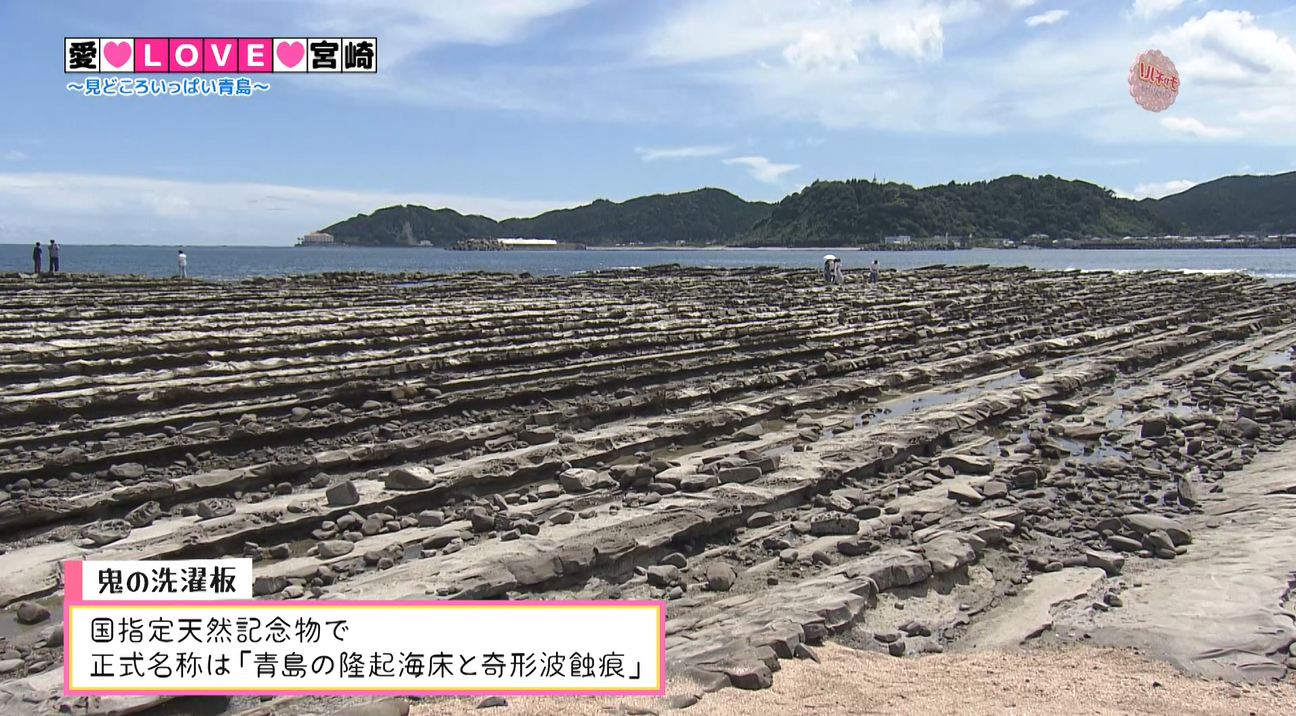 青島周辺に広がる奇岩群「鬼の洗濯板」は、およそ700万年前の地層が隆起して、波の浸食を受けた硬い砂岩層だけが板のように積み重なって残ったもので、国の天然記念物です。