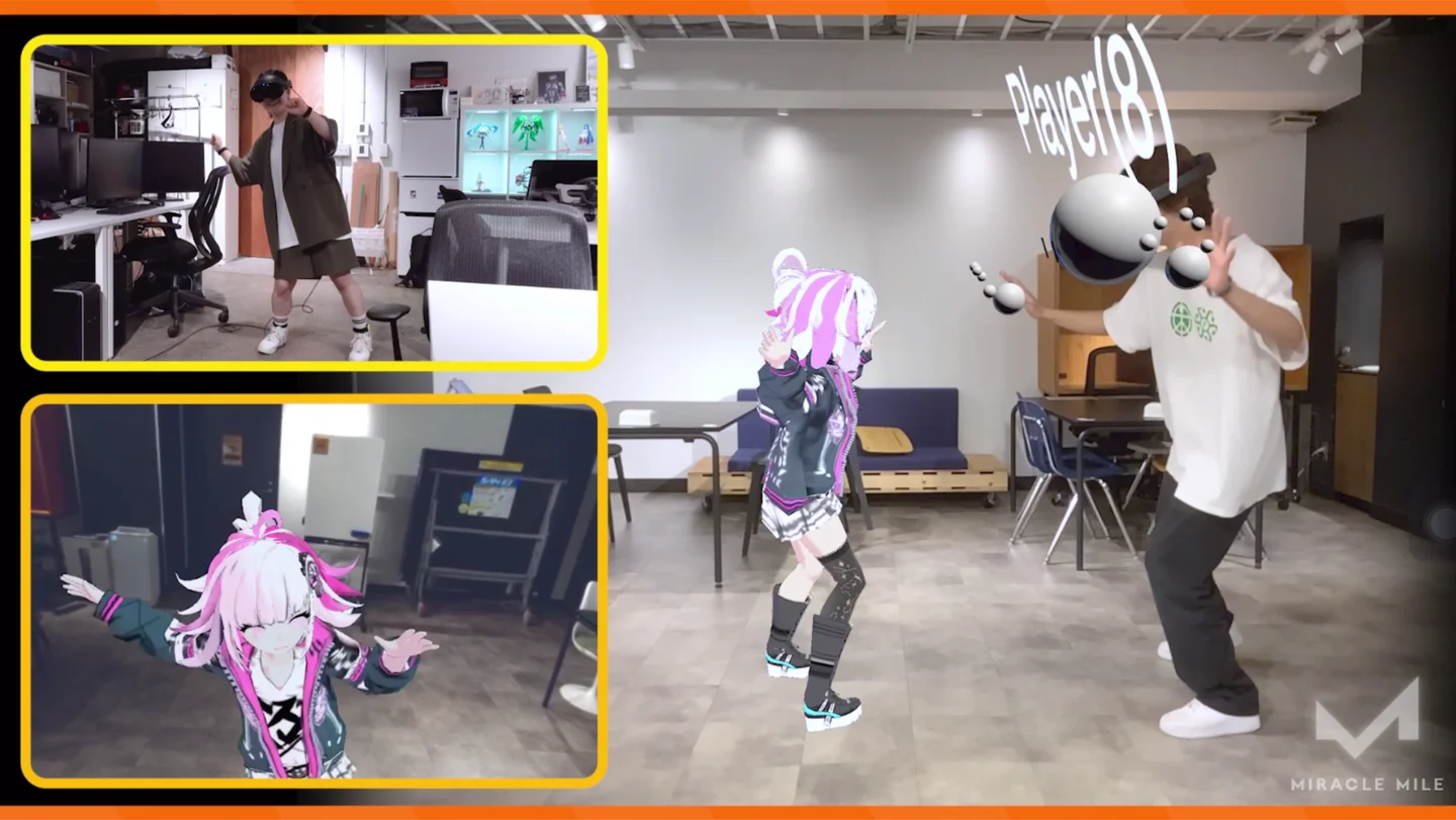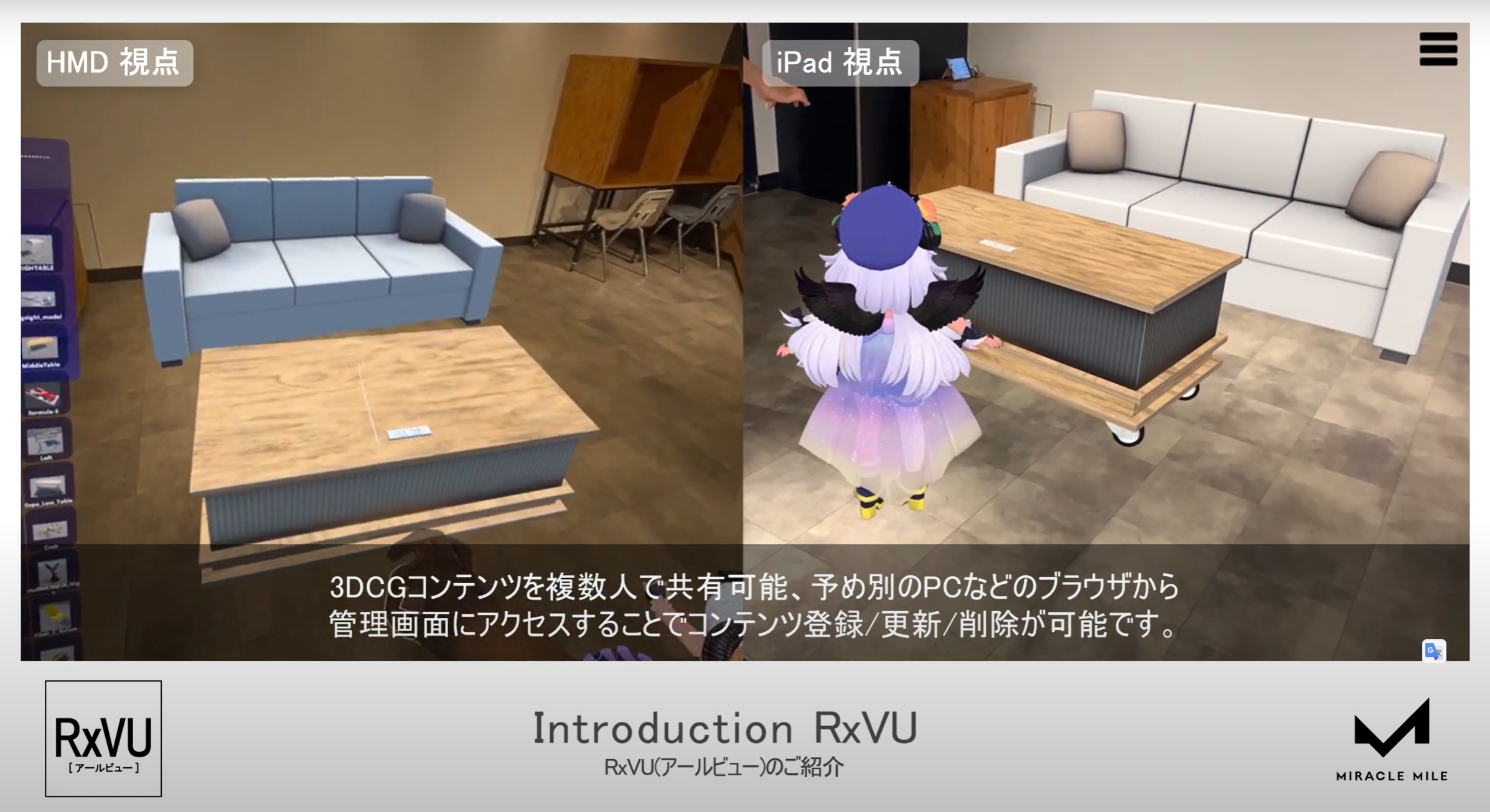 3DCGやVFXを活用した映像制作や空間表現を得意とするクリエイティブ企業です。出展では、MRコンテンツ「RxVU」と「MARINNE」をデモ展示。RxVUは3DCGをMR空間に配置して構造やレイアウトを検証できるシステムで、舞台演出や建築設計などに活用可能です。MARINNEはMR空間にキャラクターを登場させ、来場者が直接おしゃべりできる体験型コンテンツです。