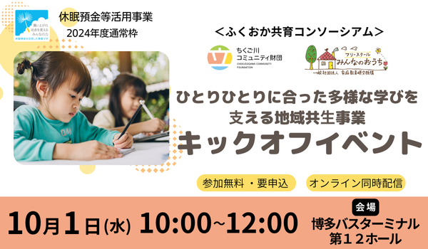 この度、事業開始にあたりキックオフイベントを10月1日に福岡市博多区で開催いたします。実行団体とともに、これから取り組む事業について発表します。市民や教育関係者、不登校の子どもがいる家庭など幅広くご参加いただきます。ぜひご取材のほど、ご検討いただけますと幸いです。