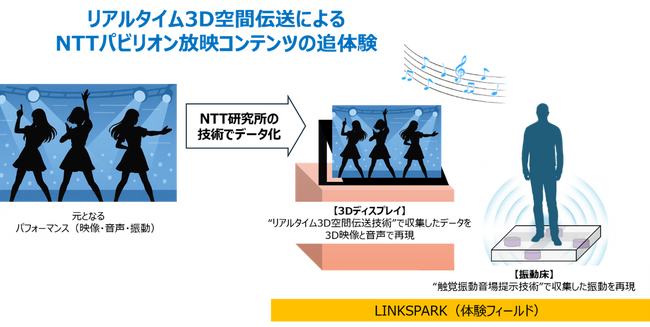- リアルタイム3D空間伝送によるNTTパビリオン放映コンテンツの追体験NTT研究所が開発した“リアルタイム3D空間伝送技術”を活用し、音楽・映像コンテンツを3Dディスプレイで表示。さらに“触覚振動音場提示技術”により、音楽と映像に加え、振動する床を通じて、空間の臨場感を五感で体験いただけます。