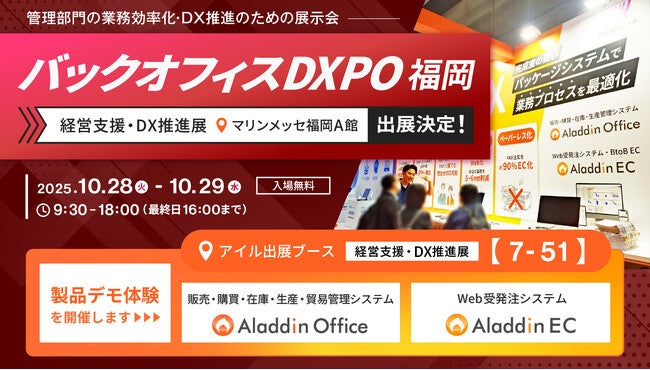 自社開発の業務管理システムで、企業のデジタル化推進と経営力向上を支援する株式会社アイル(本社:大阪市北区・東京都港区、代表取締役社長:岩本哲夫、東証プライム:3854)は、2025年10月28日(火)・29日(水)にマリンメッセ福岡にて開催される、管理部門のDX推進のための展示会「バックオフィスDXPO 福岡’25」に、販売・在庫・生産管理システム「アラジンオフィス」とWeb受発注システム「アラジンEC」を出展します。九州地区での大型展示会への出展は今回が初となります。