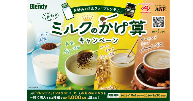 味の素AGF株式会社(代表取締役社長:島本 憲仁 以下、味の素AGF)は、《「ブレンディ(R)︎」インスタントコーヒー》の新たな提案として《「ブレンディ(R)」ミルクのかけ算キャンペーン》を2025年10月1日(水)から2026年1月30日(金)まで実施します。