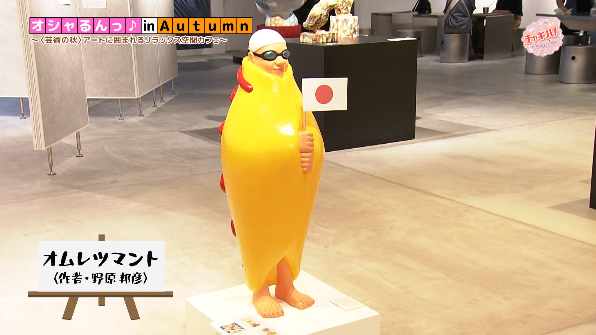 こちらは彫刻家・野原邦彦さんの作品「オムレツマント」です。オムレツの形をしたマントをまとった人物をモチーフとした彫像作品で、ファミリーレストランでお子さまランチをワクワクして待っている気持ちを表現しています。