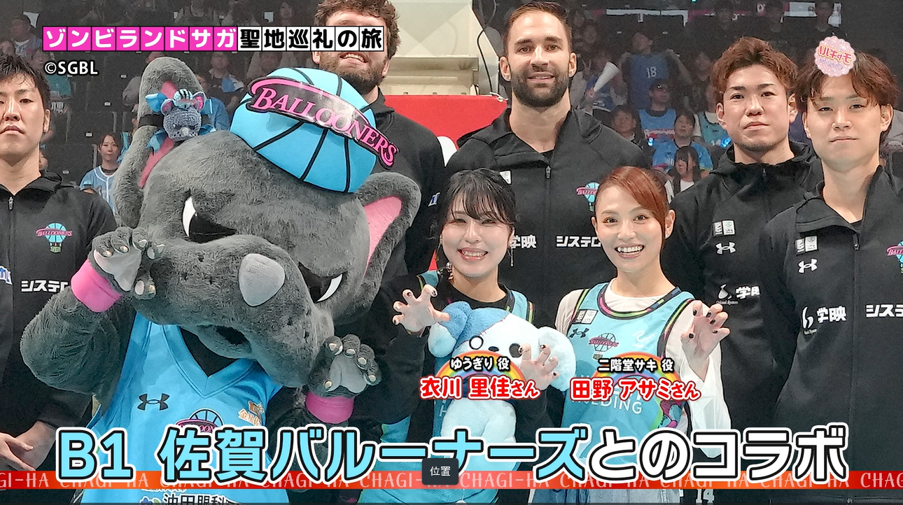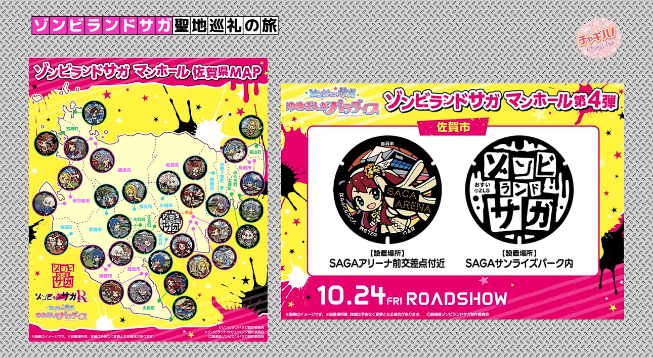 バスケットボール・B1の佐賀バルーナーズとのコラボでは、佐賀市のSAGAアリーナに声優の田野アサミさんと衣川里佳さんが登場し映画をPRしたほか、佐賀県内20市町村に点在するデザインマンホールが増設されるなど、佐賀県ではいま、ゾンビランドサガでさらなる盛り上がりを見せています。