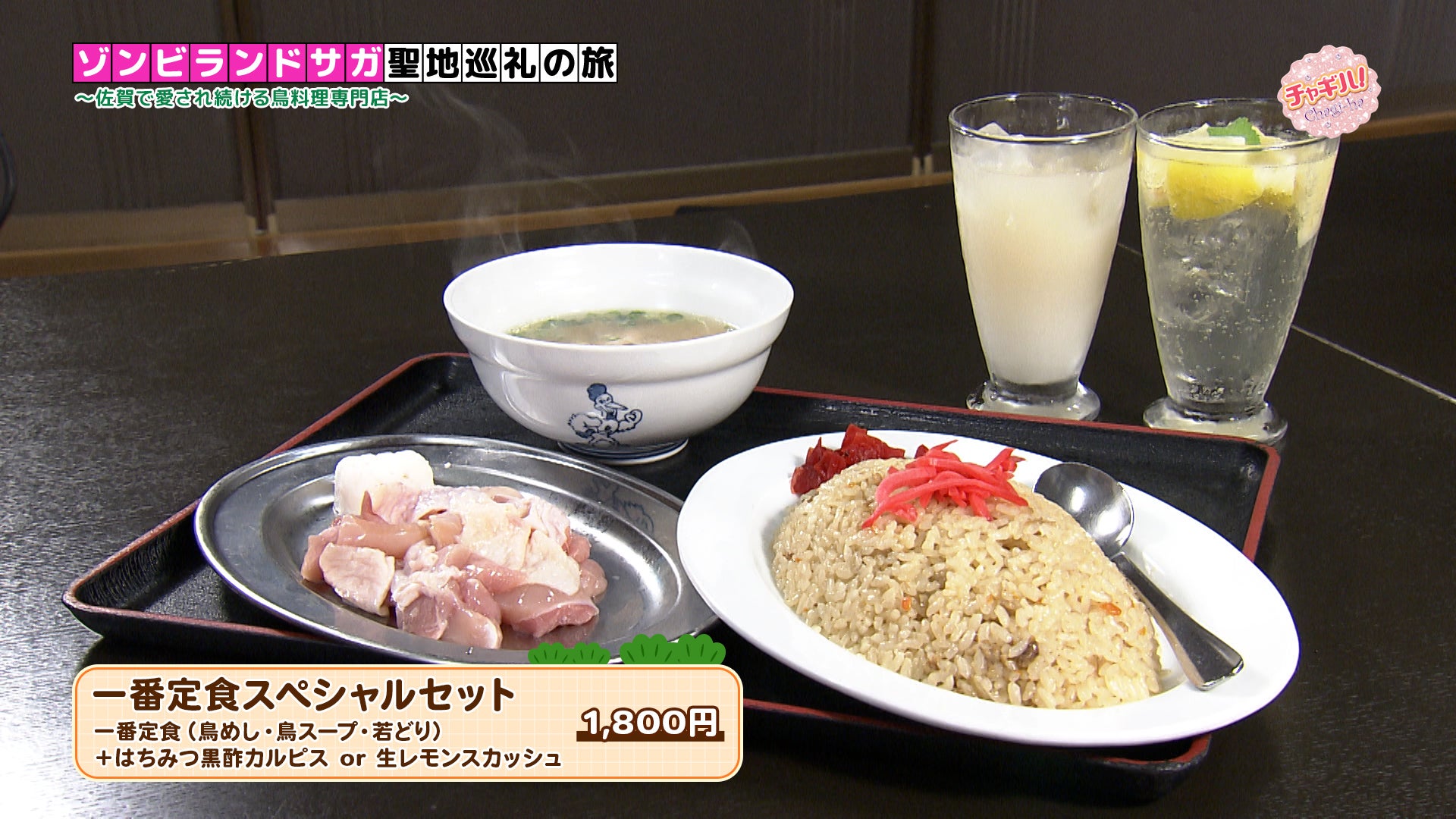 佐賀県民のソウルフード「ドライブイン鳥」の鶏肉(若どり)と鳥めしがセットになった一番定食。スペシャルセットには、ゾンビランドサガのコースターがついています。
