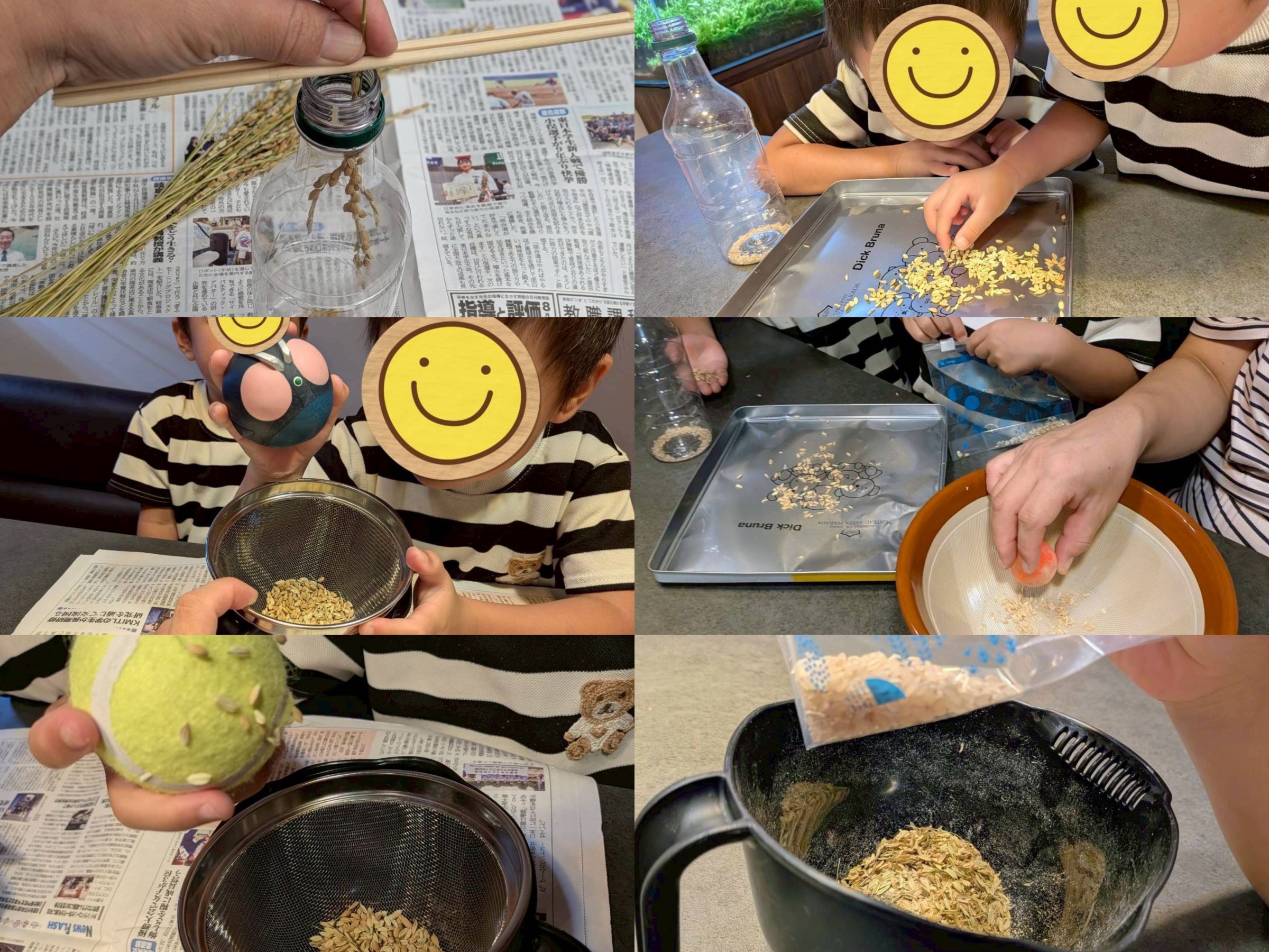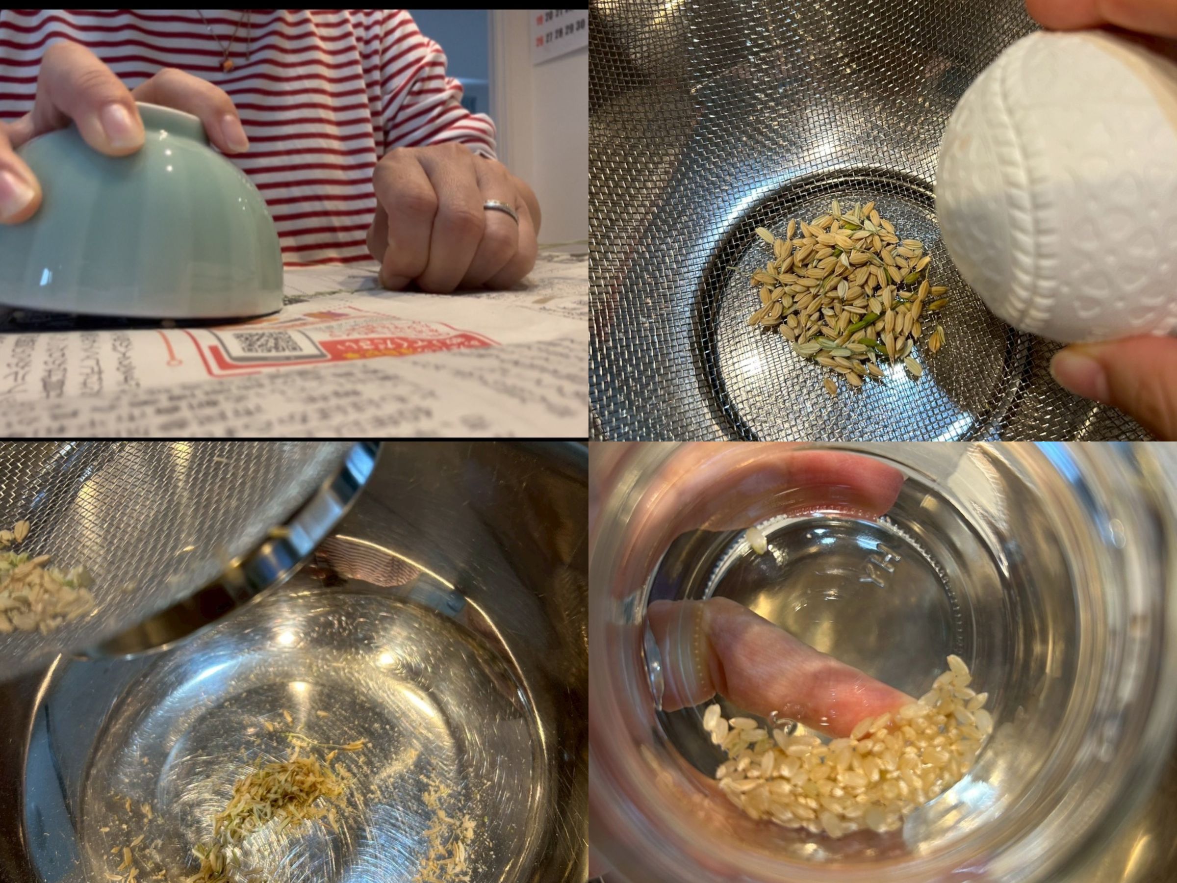作業から1時間してすり鉢があった事に気が付き、そこから子供と共にもみすりと同時進行で玄米を一粒ずつ集めていきました。