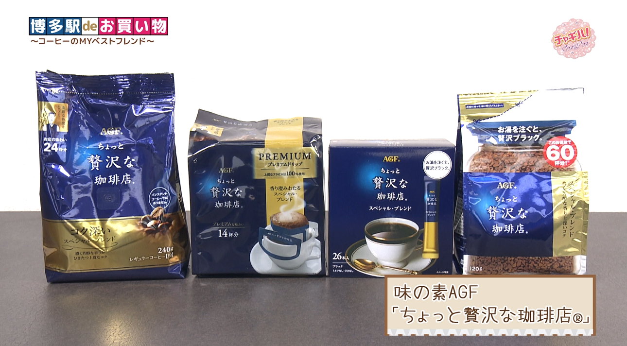 コーヒーは味の素AGFの「ちょっと贅沢な珈琲店」。九州まろやかブレンドは、九州エリアで好まれる味わいを追究した、まろやかで、ほどよい酸味が特長です。