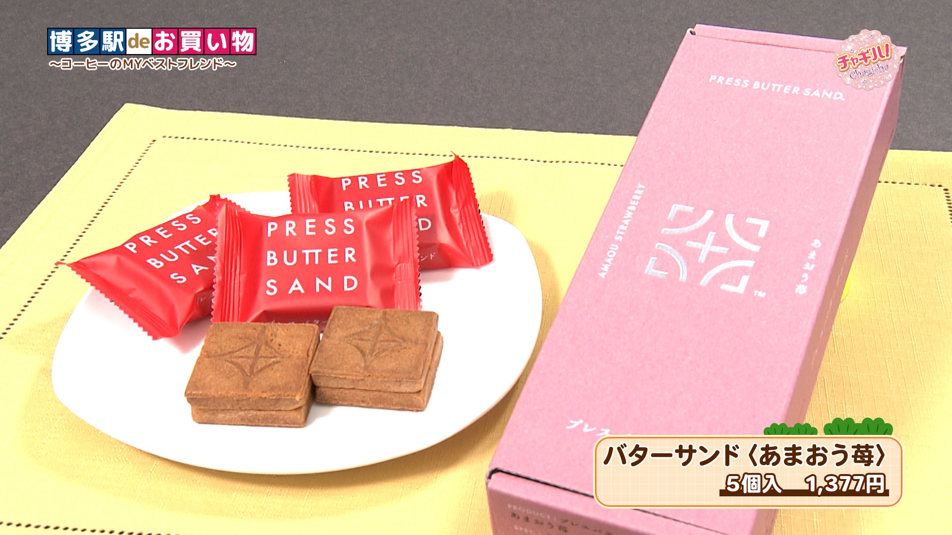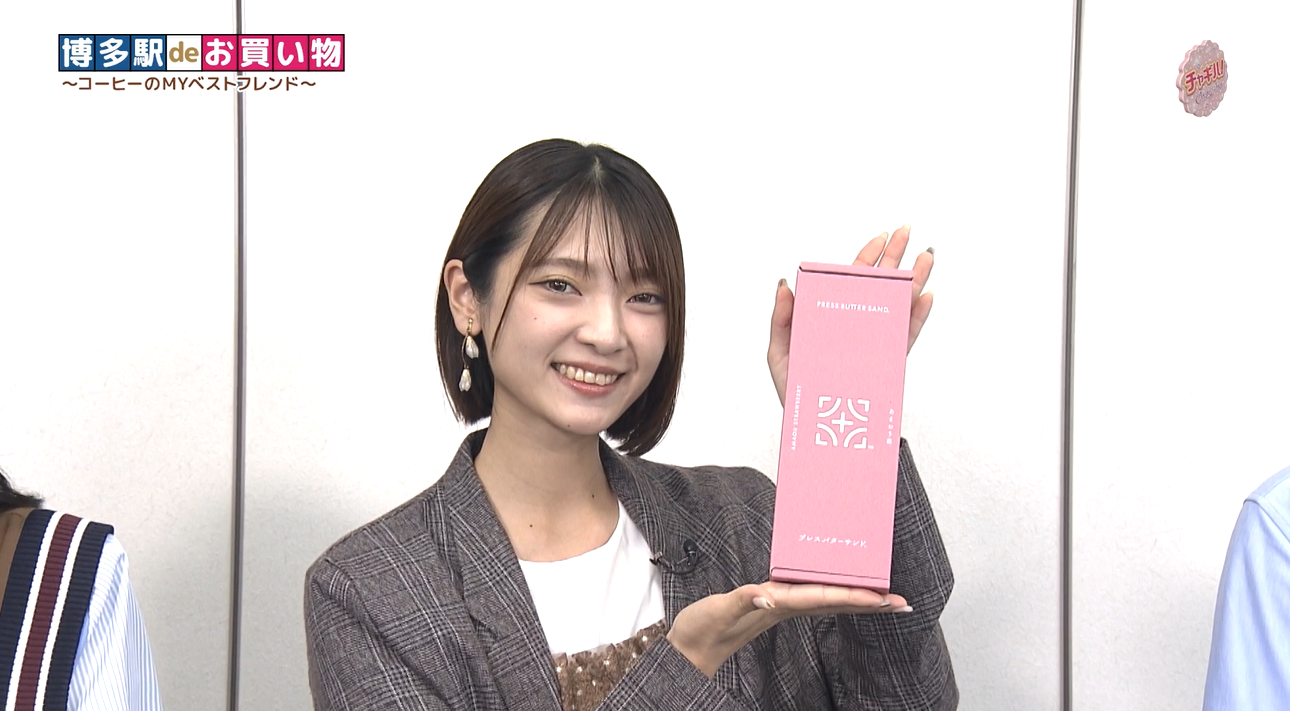 ミスミンが選んだのは、「いっぴん東通り」の「プレスバターサンド」で販売されている福岡県産のイチゴ「あまおう」を贅沢に使用した『バターサンド〈あまおう苺〉』。イチゴジャムを練り込んだバタークリームと、あまおうの濃縮果汁を使用したバターキャラメルを、サクサクのクッキーに挟み込んだ一品です。