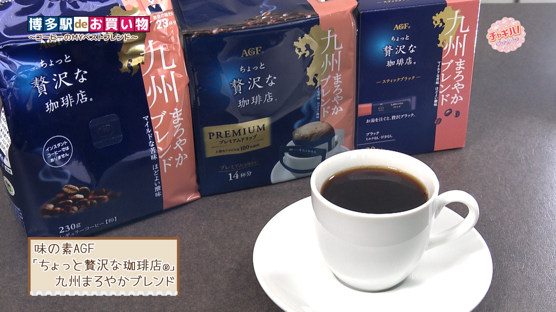 コーヒーは味の素AGFの「ちょっと贅沢な珈琲店」。九州まろやかブレンドは、九州エリアで好まれる味わいを追究した、まろやかで、ほどよい酸味が特長です。