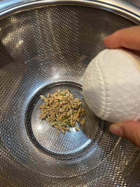 籾摺りは、すり鉢がなかったので、ザルと軟式野球ボールで・・・