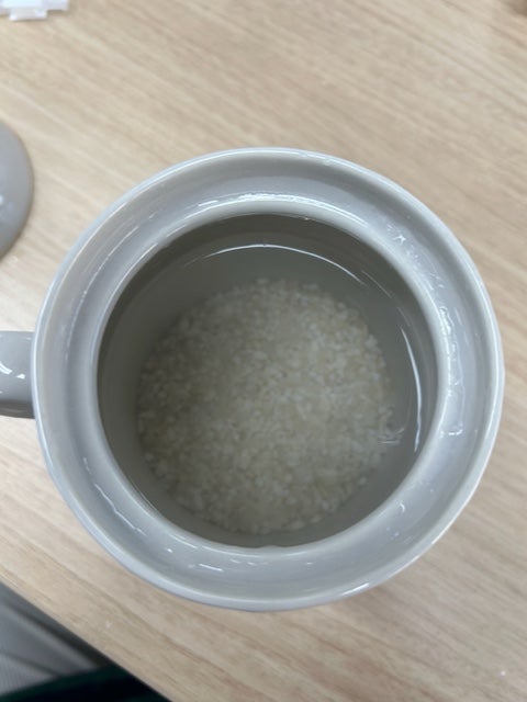 鍋で炊いても失敗しそうなので、100円ショップで販売している半合炊きのマグカップで炊くことに。