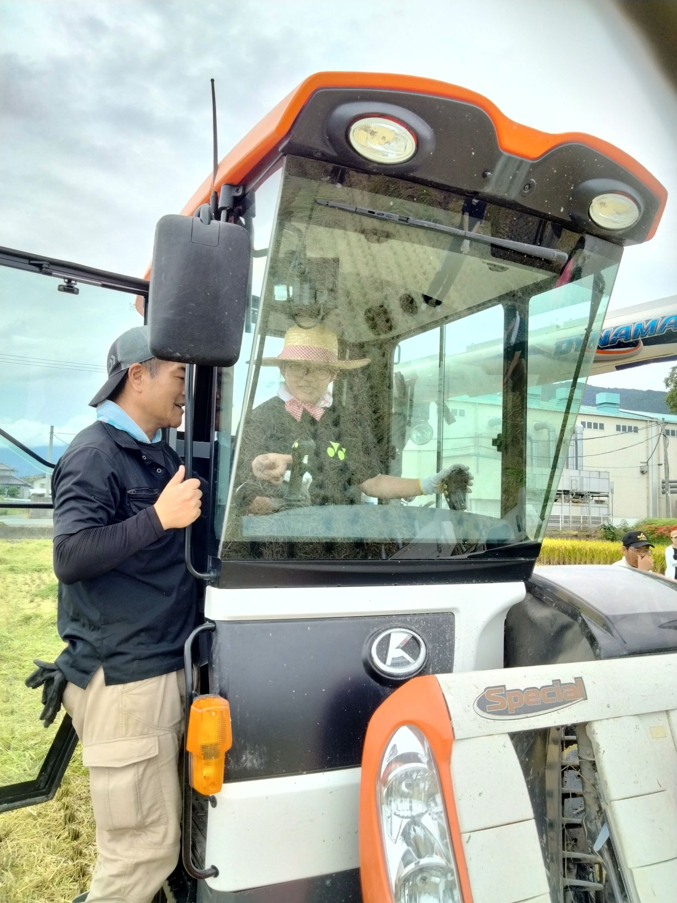 コンバインの使い方を教えるJA福岡市の富永常務理事